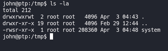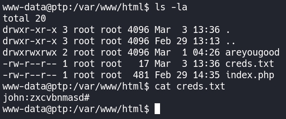 and yes the command has executed, and we have system (which is find binary) with suid permissions, so now we can use our previous privilege escalation technique but with some changes, but we should remember that johns’ shell has some restricted command so we switch again to www-data to avoid the restrictions and execute it: