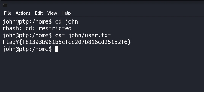I moved to /home directory, and switch user to john, and maybe we have restricted shell for some command, but we got the user.txt flag: