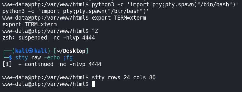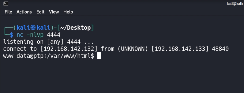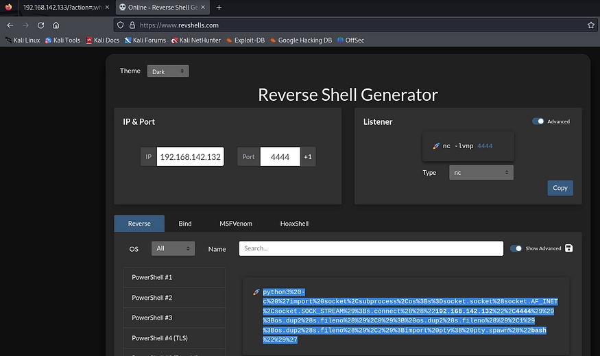 I gave it my IP and port I wanted, and here we have our python but before, we have to set a netcat listener on the same port to get the reverse shell.