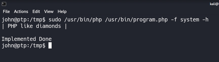 ?>as we see above that we have to put f and set a function as option in our sudo command and empty -h option it will copy find binary to tmp with what we specified for f option for example exec, and it will make it suid binary, so we can run it as root without password. lets check it out: