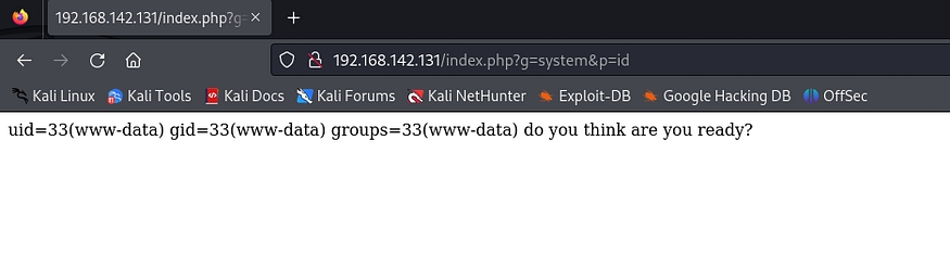 as we see above if g and p are not empty we call g on p, so lets call system function from php on what we input for p: