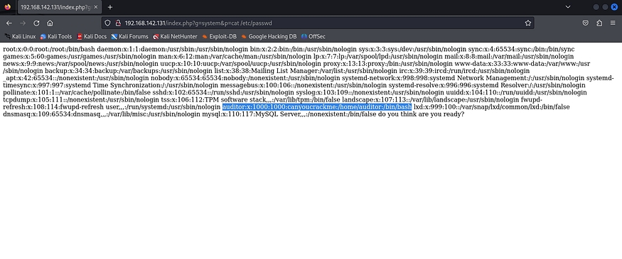 we have command injection, cat /etc/passwd we find a user that is not a system or service user which is auditor.