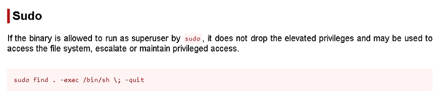 so using gtfobins to try to find a sudo command with find to escalate our privileges to root: